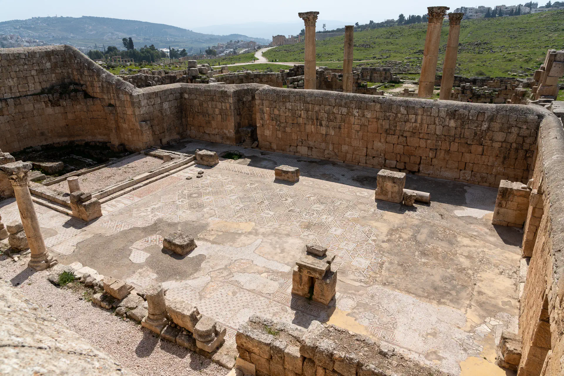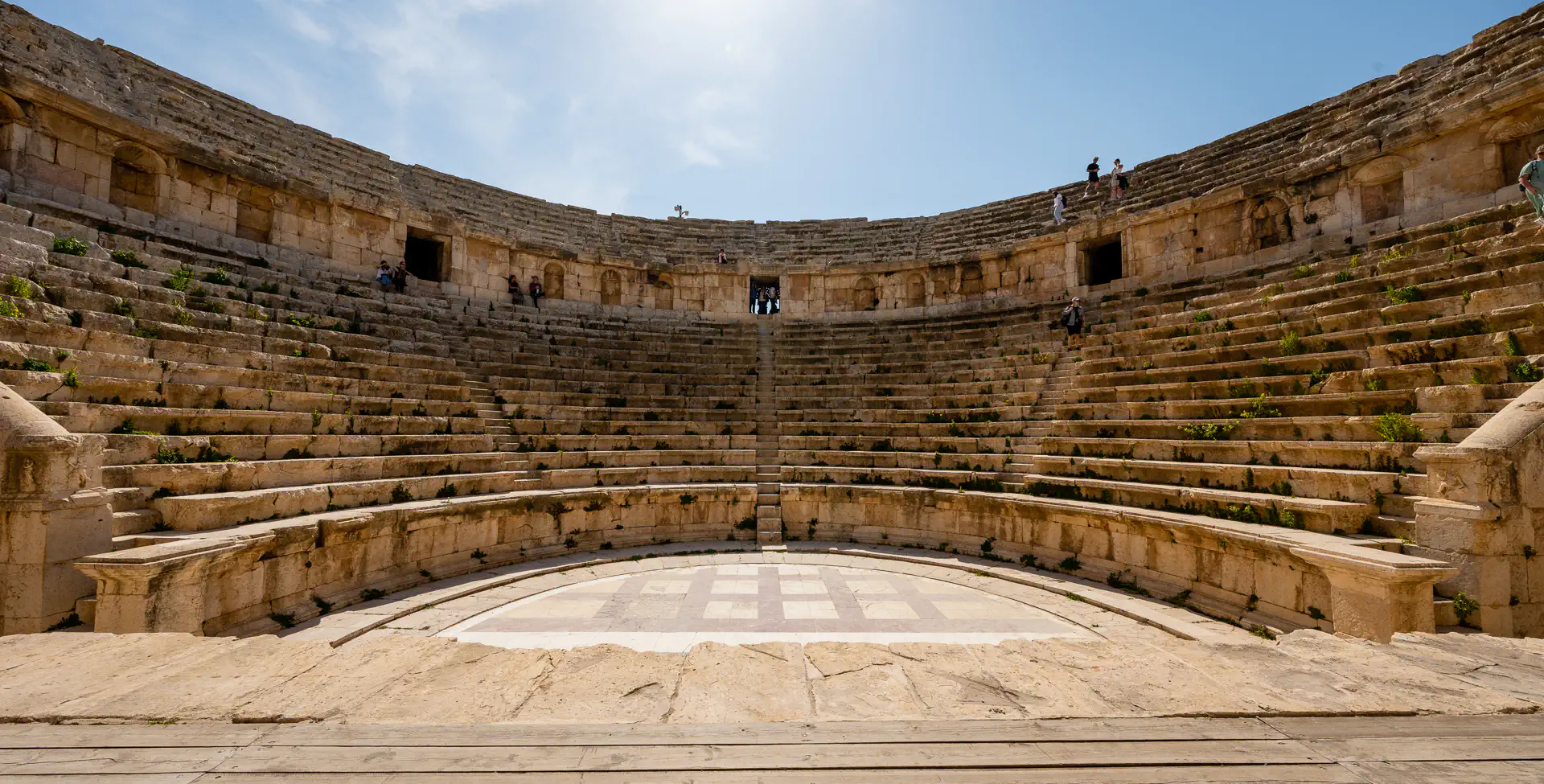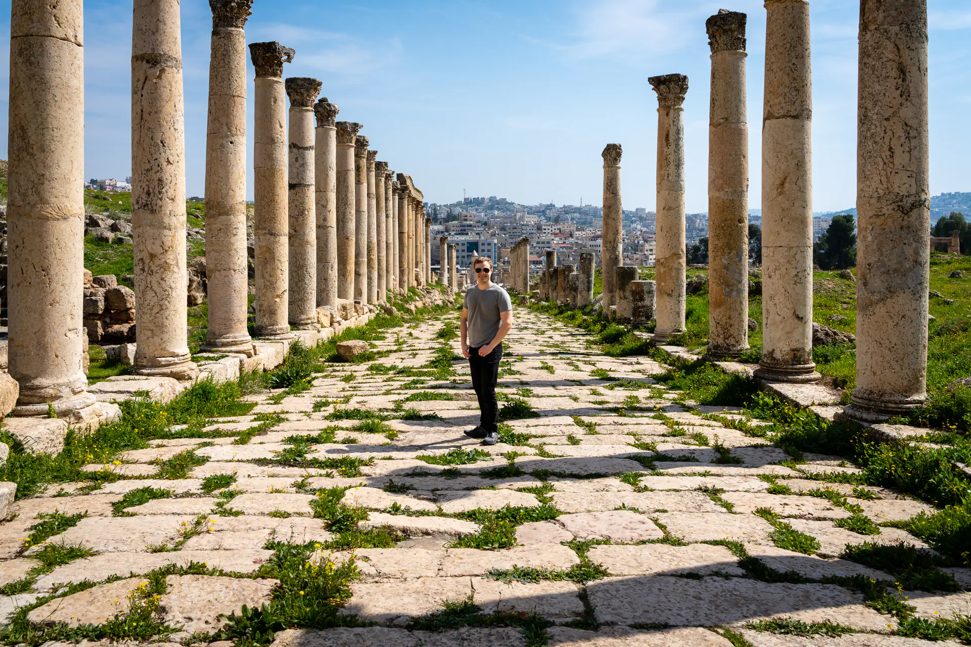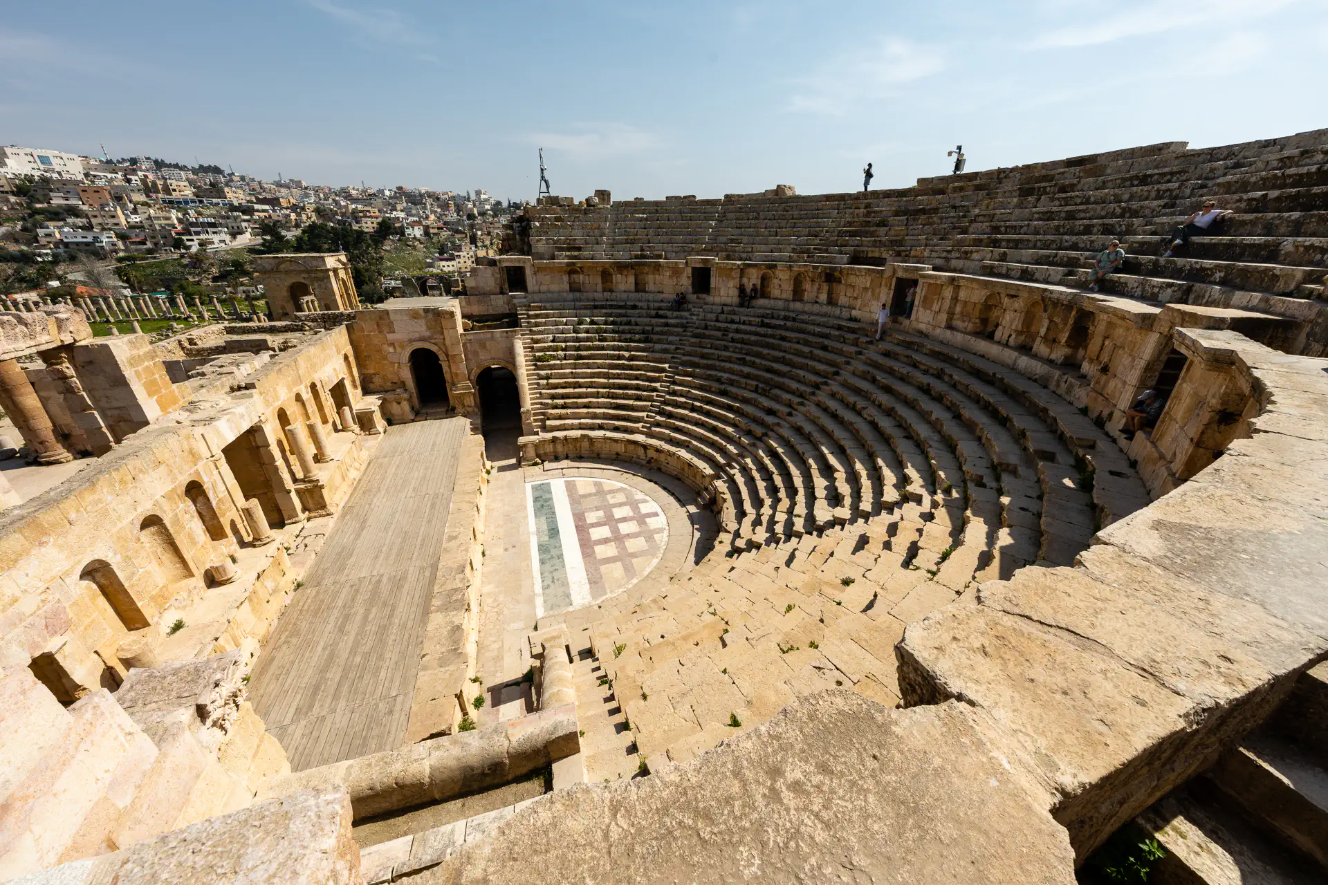 We then headed to the Jerash Ruins which are famous for being one of the world’s best-preserved Greco-Roman ruins! You enter the site through the imposing 36-foot-tall Hadrian’s Gate with it’s triple arches—the large central arch for chariots and the two smaller archways for pedestrians. One was reserved for noblemen and the other was for commoners. I was awed by both the size and the intricately preserved detail. There were two amphitheaters both with incredible acoustics: the North Theater for the wealthy and the 3000-person South Theater for the poor. You can still walk the aisles of both today and even sing from the stage if you want. Even speaking softly gets amplified so that the entire amphitheater can hear you! There are also soaring temples dedicated to the gods of the day like Zeus, Athena, and Artemis. Colonnades line both the streets and the Hippodrome. Many of the religious site floors are covered with intricate tiled patterns. There was At its peak, Jerash was home to over 20k people. It’s believed an earthquake in 749 buried much of the city’s infrastructure and was abandoned soon after. The ruins lay buried for over 1000 years until a German researcher, Ulrich Jasper, discovered them in 1806.
