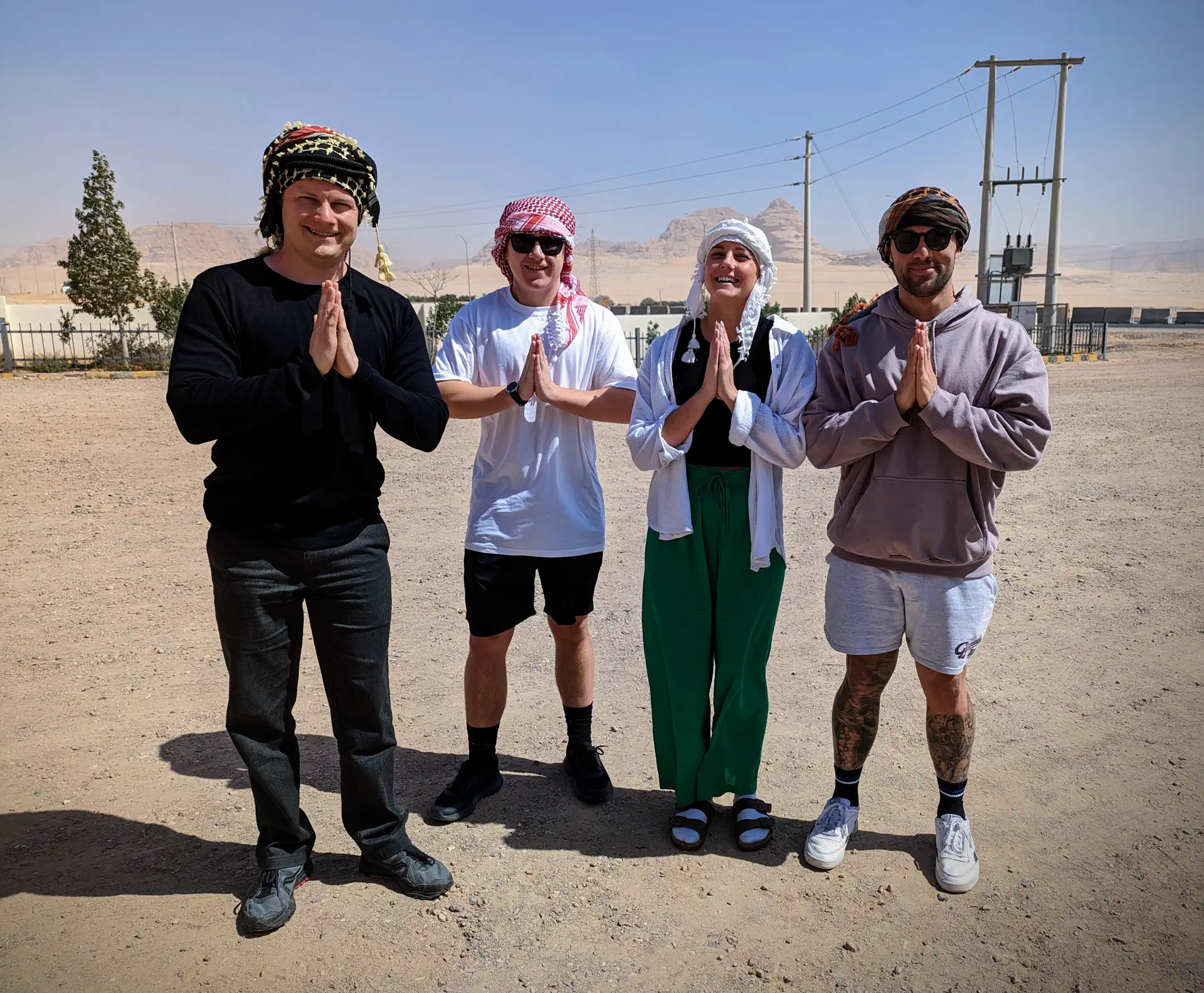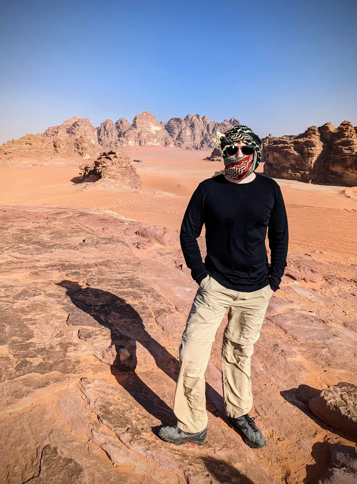 We boarded a bus in Amman and began our 4-hour jaunt to the desert on the southern border. When we stopped at a rest stop/trinket emporium a few of us purchased scarves known as keffiyeh which we modeled before hopping back on the bus. Since I had gotten badly burned on my first day, I was determined to wear as much protection as possible for the rest of the trip. You can just call me Muad’Dib because I’ve got the spice! I later learned that each country has its own color identity when I was complimented in Egypt for my Arabian scarf; they suggested I purchase a white Egyptian replacement. 😆