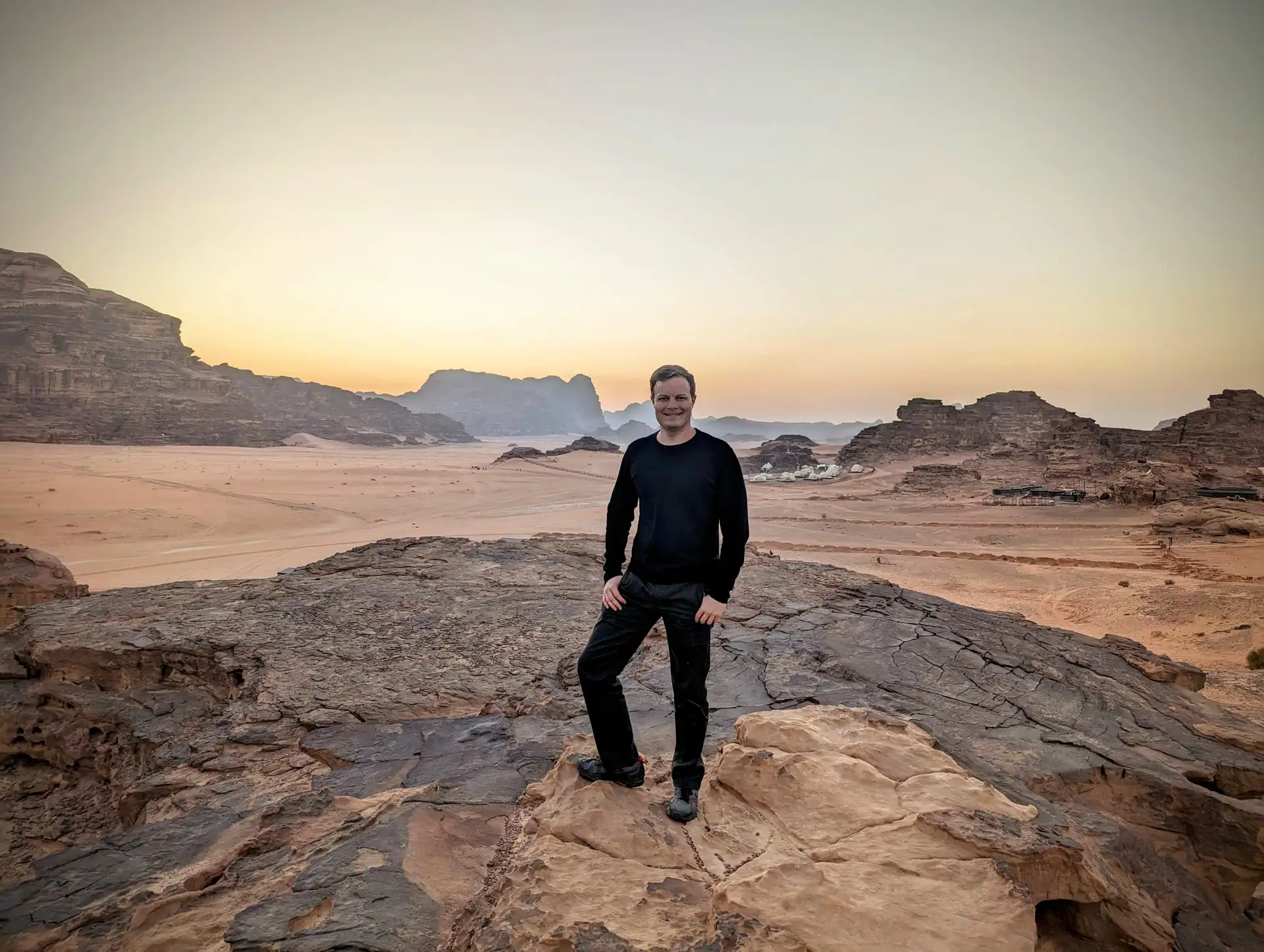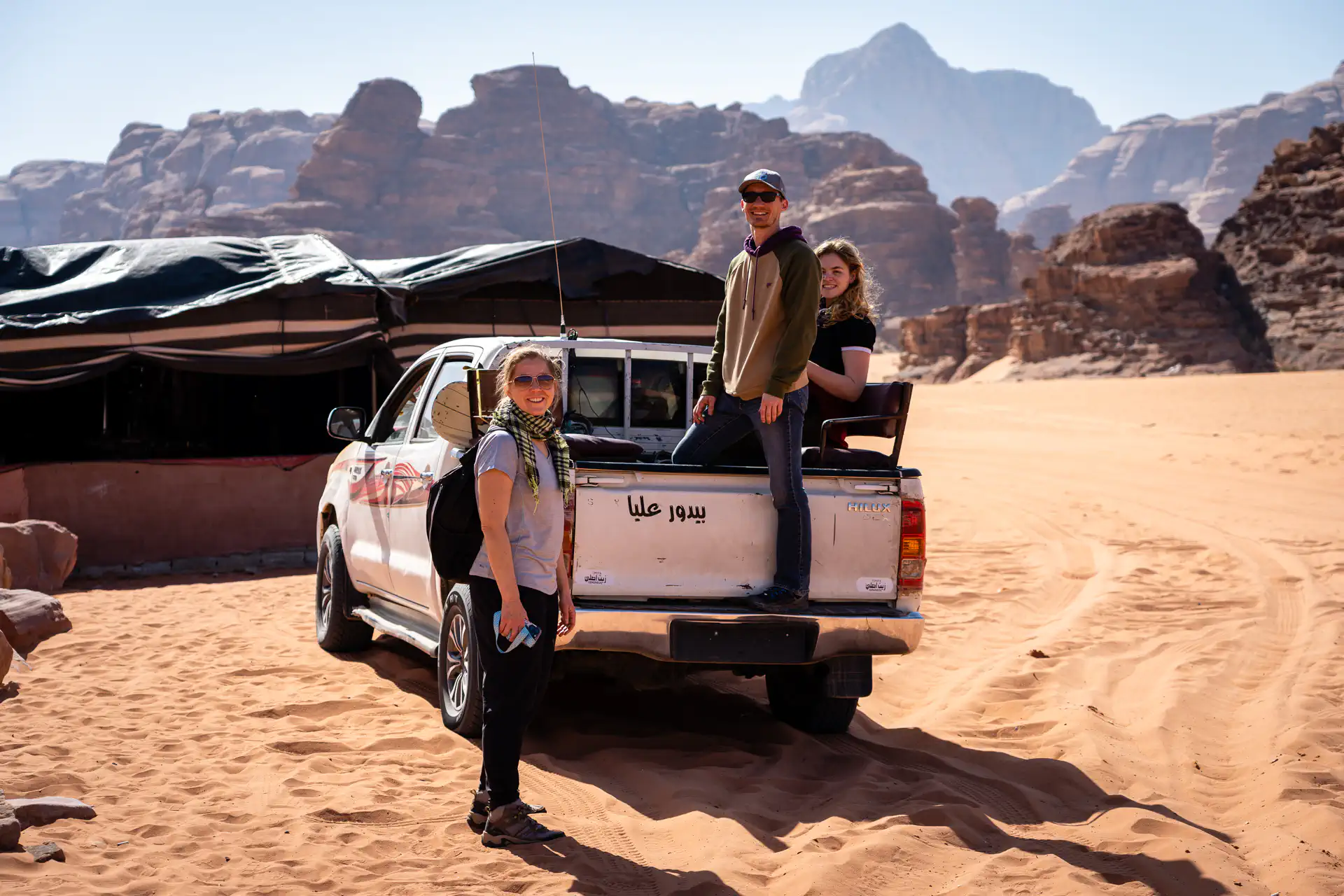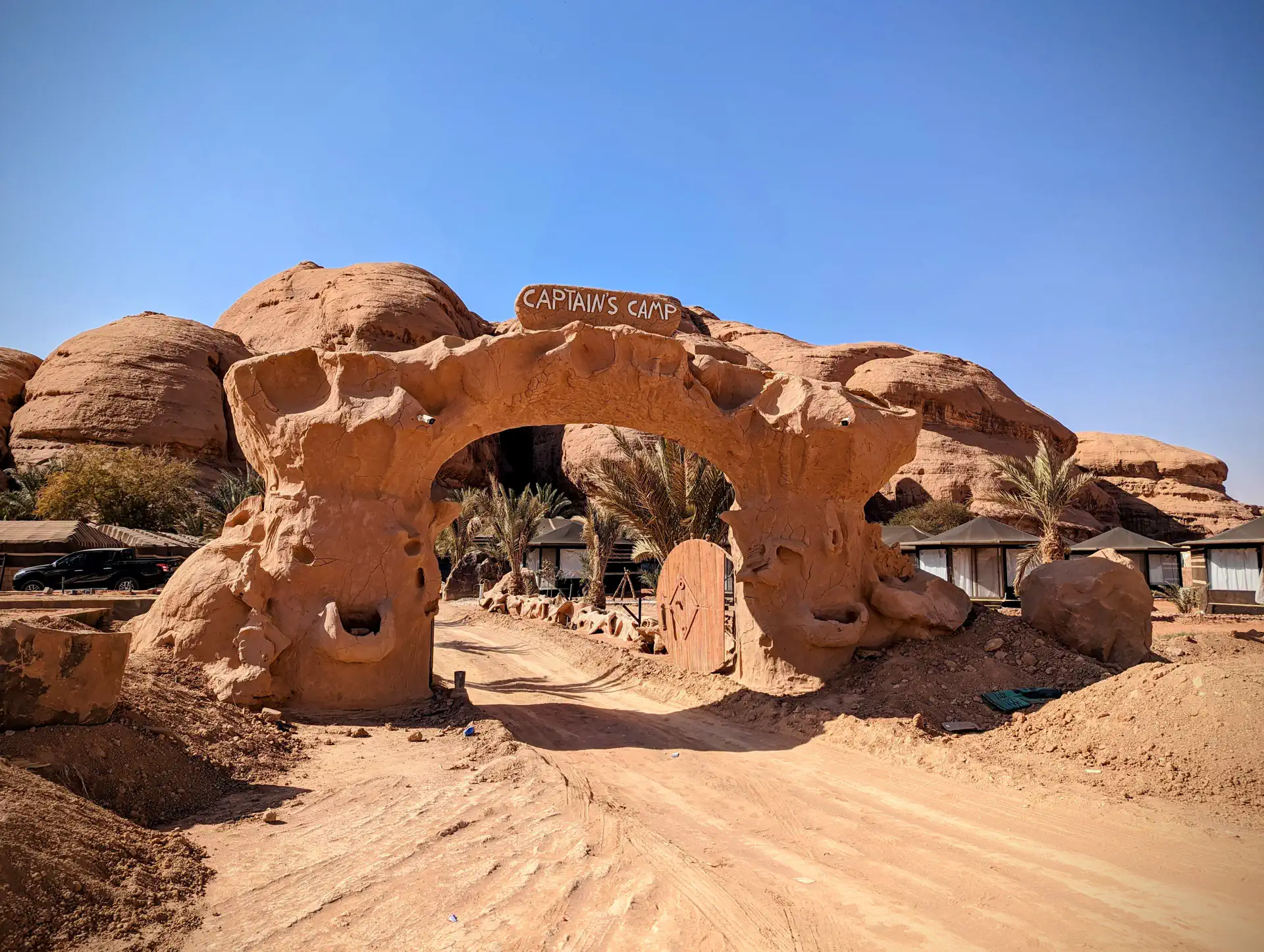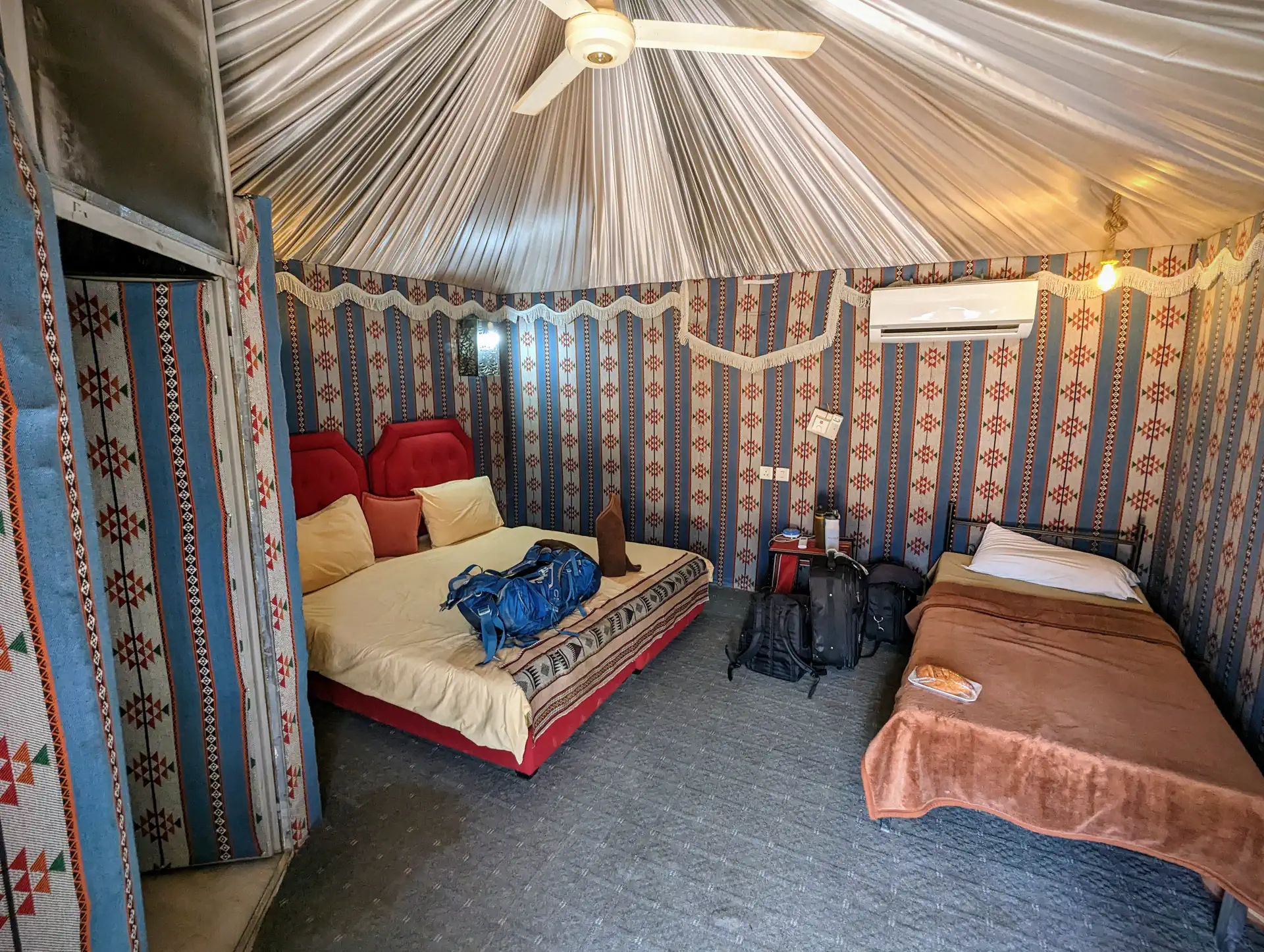 The Wadi Rum Protected Area has been a UNESCO World Heritage site since 2011. It’s a popular location for filming, so you’ve probably seen its impressive landscapes in movies like Dune, The Martian, Aladdin, and Star Wars among 46 others! There are many varied camp experiences in the area including the popular albeit expensive Mars Camp where you stay inside a white “Martian” dome tent. We stayed at the more economical Captain’s Camp. It qualified as a glamping experience since there was indoor plumbing, but we were missing a toilet seat in our room so that made for a fun experience.