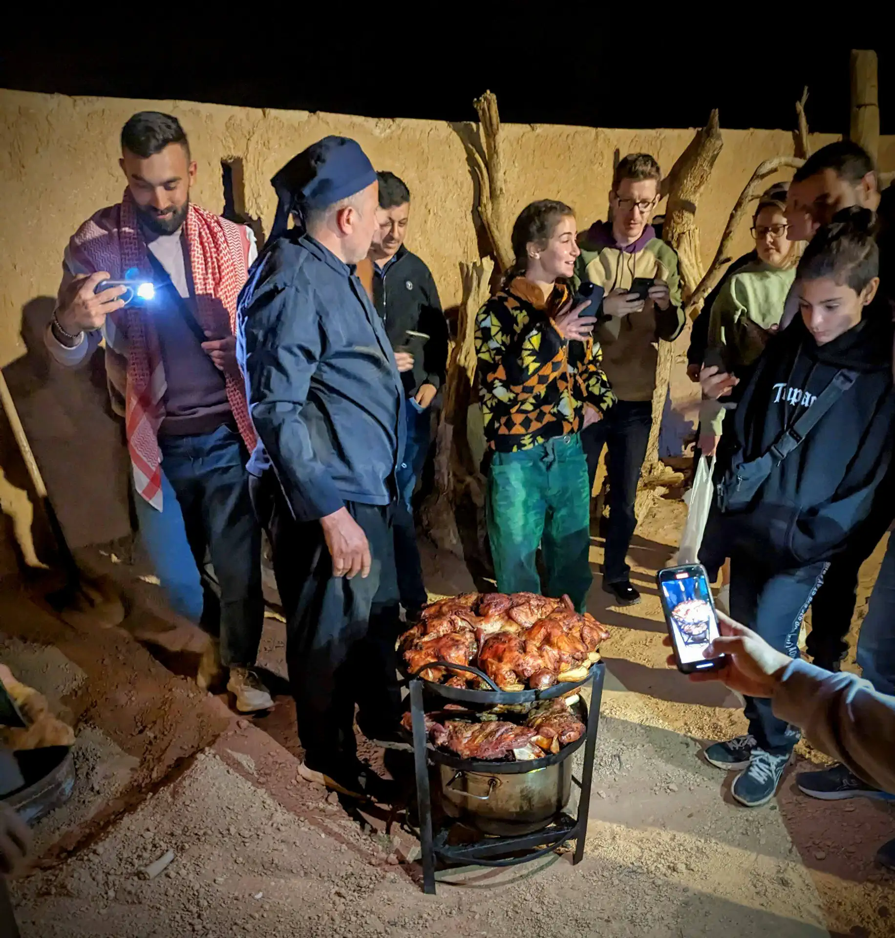 We went on a sunset hike and returned to camp awaiting the arrival of the rest of our group. When they arrived hours late, they told us that their boat from Nuweiba, Egypt didn’t have a specified time of departure—it left only once it was full. So they had been sitting in the port for hours before evening starting their hours-long voyage. The camp staff had prepared a traditional Bedouin feast for us: Zarb. It’s a technique where the meal is prepared underground for many hours. There was lamb, chicken, carrots, and onions that were put in a container in a deep hole which was subsequently filled with hot coals and sand. Then blankets were put on top to trap even more heat. The result was juicy, tender meat infused with the essence of vegetables and smoke. And then there were more sauces than I could identify to add even more flavor. It was a delicious end to our day.
