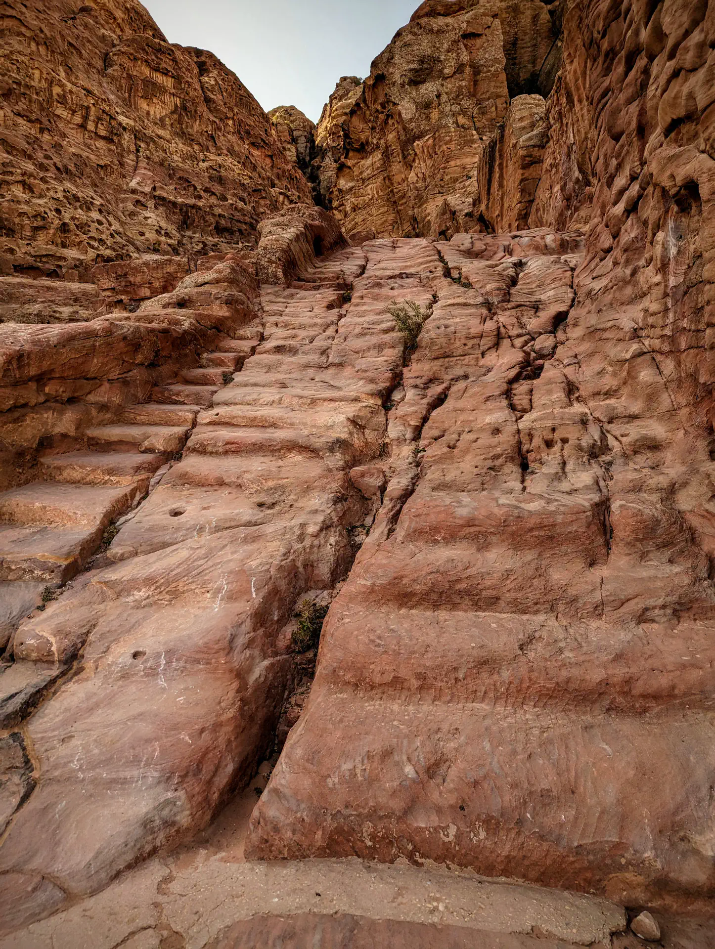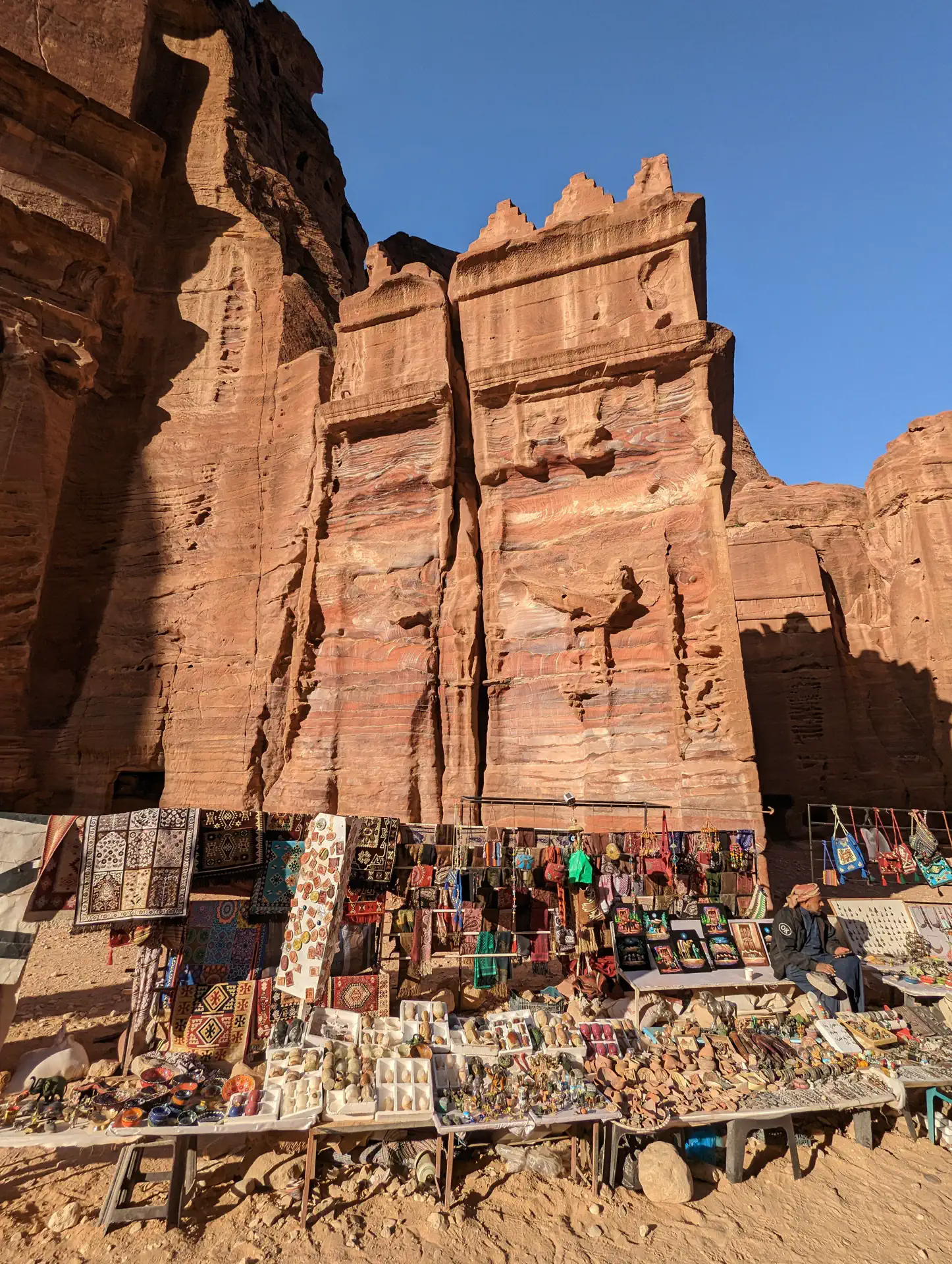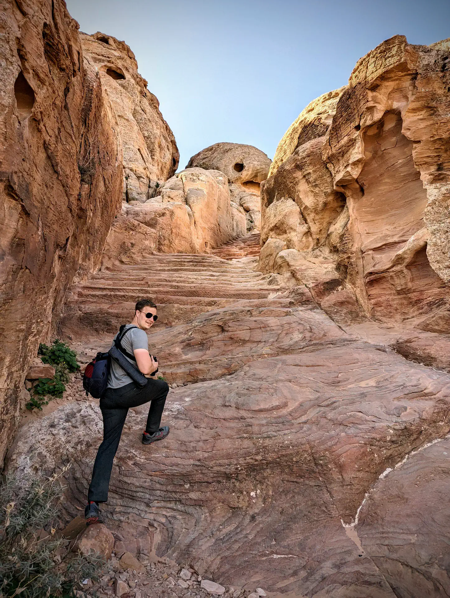 We admired the majesty of the Treasury area before splitting off into smaller groups to explore. Bedouins pushed hard to sell us an accent up an excavated a path reaching halfway up the cliff to the side of The Treasury, but I had researched a much longer path leading to the top of the cliff. Heath and I quickly headed in that direction to get to the top before the extreme midday sun since it was an exposed path. We did get distracted along the way by a large amphitheater, several other partially-eroded buildings, and “stairs” that were more of a blend between stairs and a slide thanks to the years of erosion and foot traffic. When we did make it to the top, a Bedouin had conveniently pitched his massive tent on the ledge completely blocking out any view of the Treasury. You could go inside, but signs made it known a drink purchase was a requirement of entry. ☕