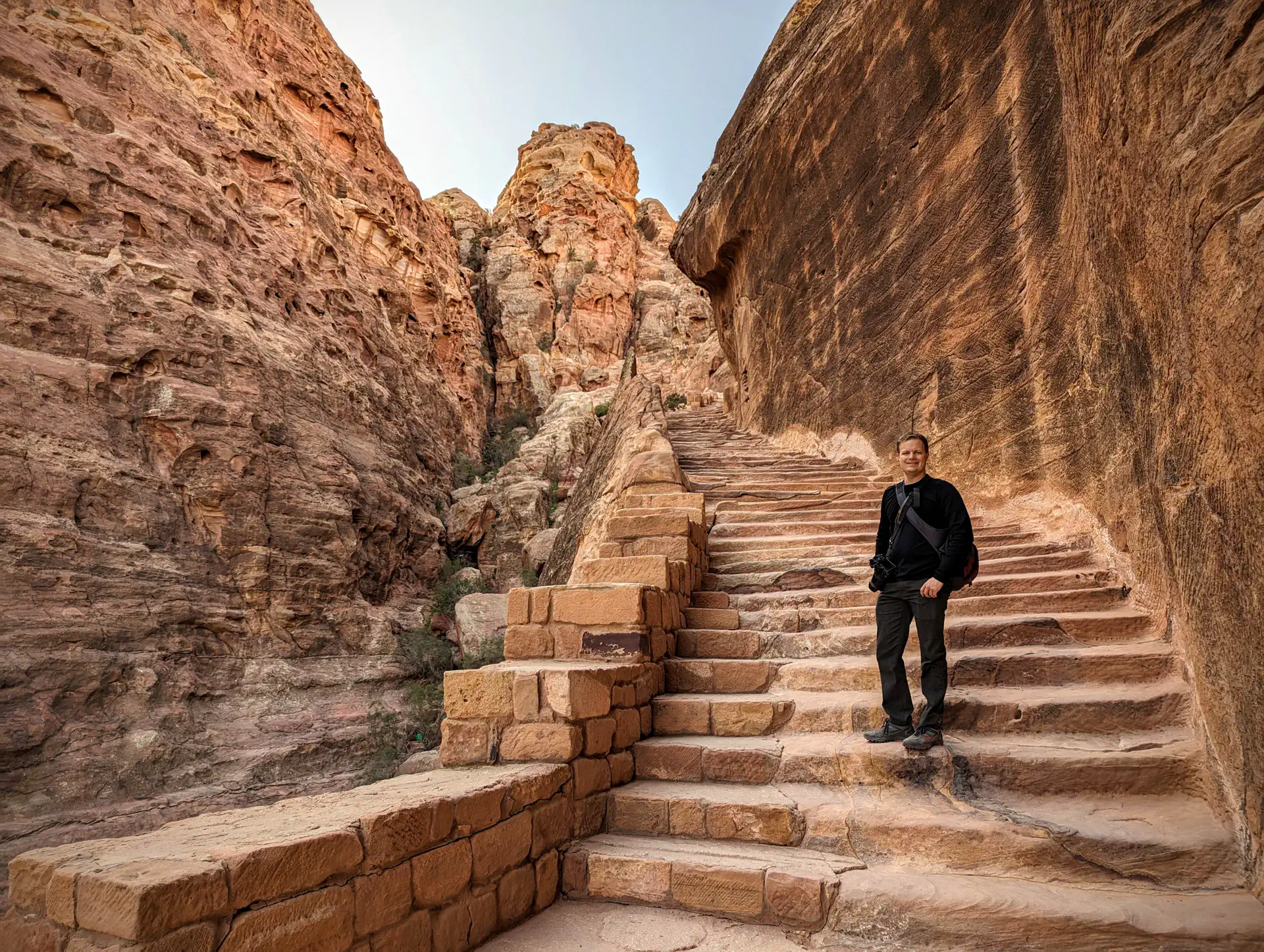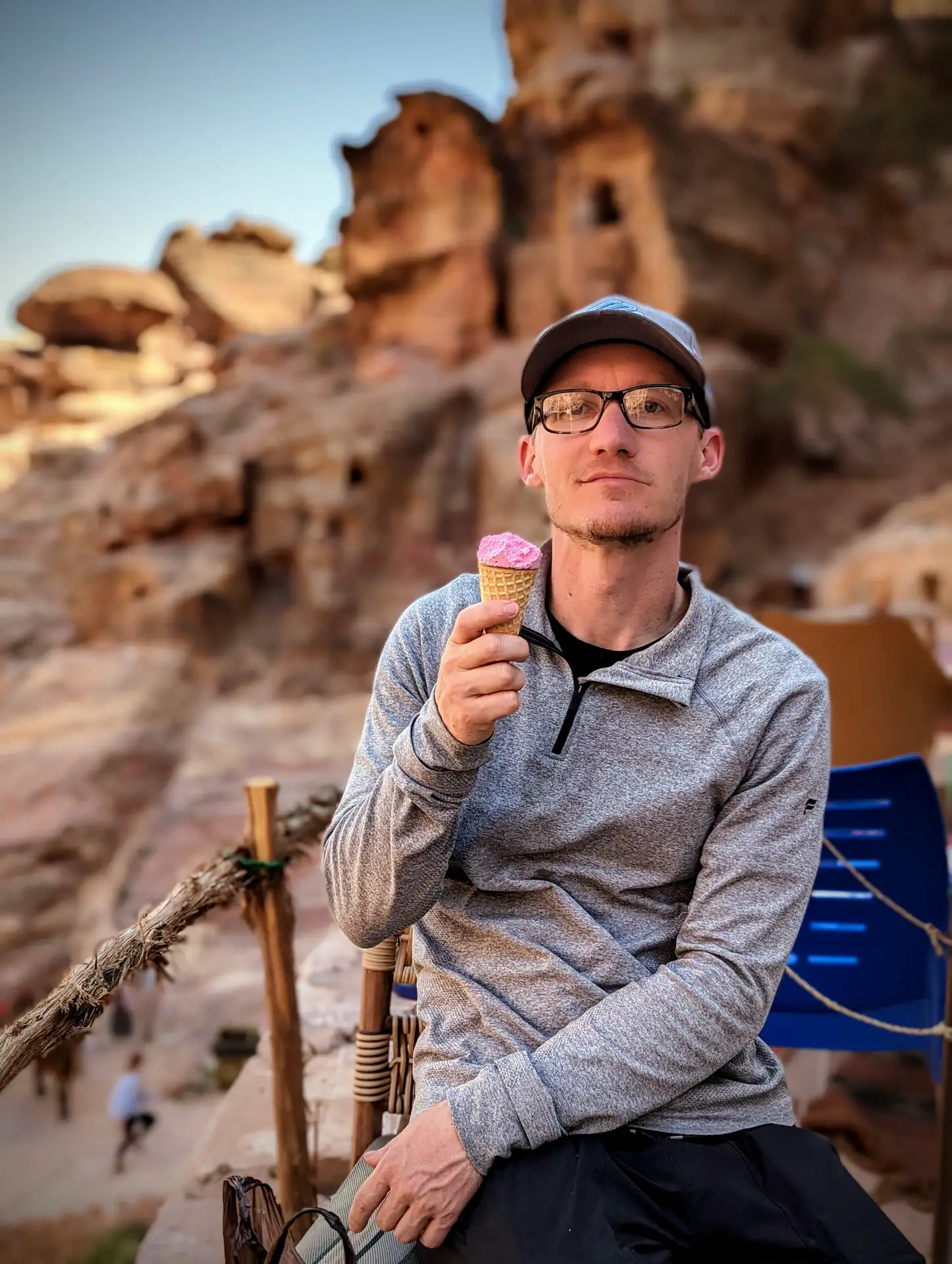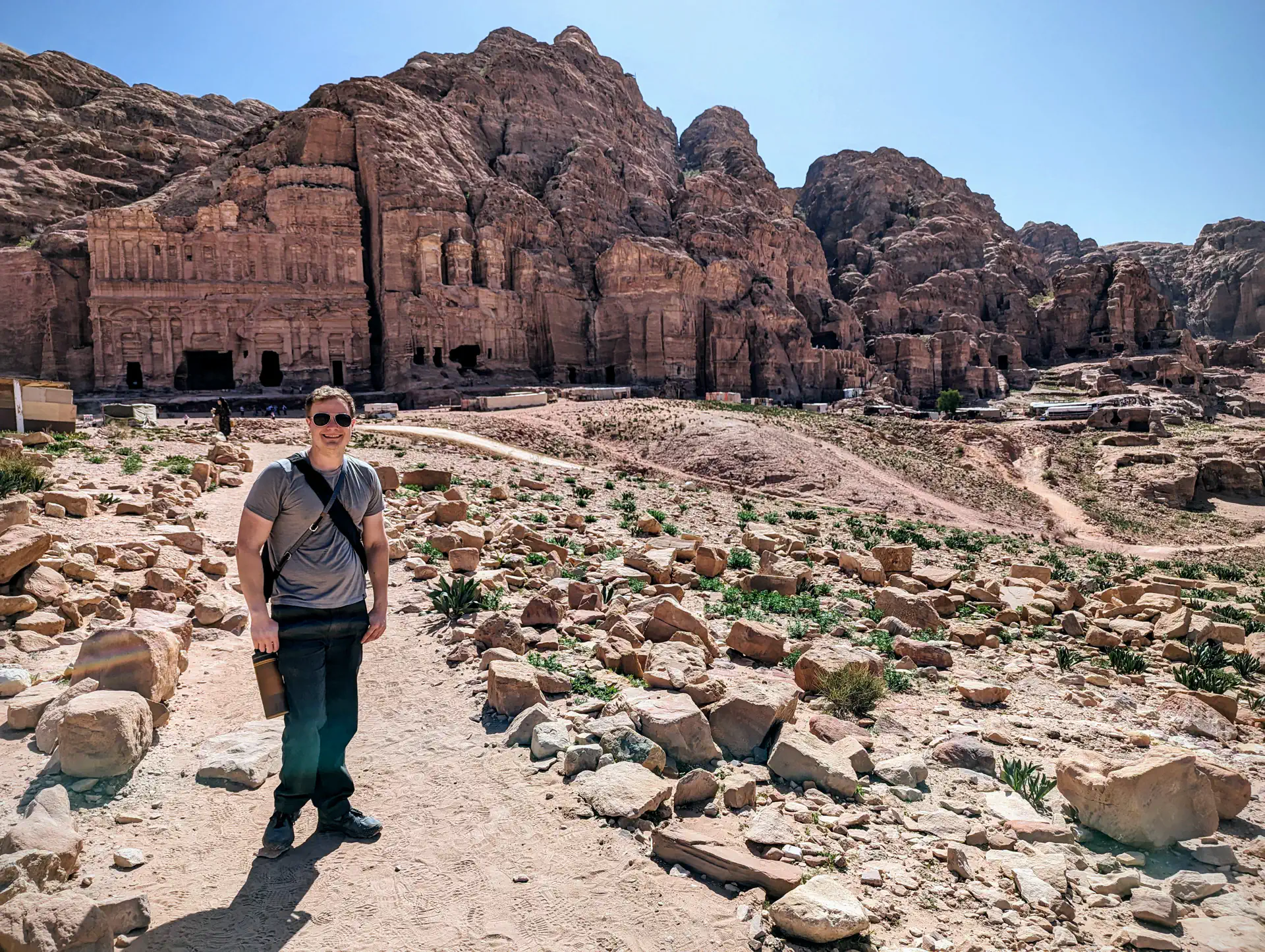We admired the majesty of the Treasury area before splitting off into smaller groups to explore. Bedouins pushed hard to sell us an accent up an excavated a path reaching halfway up the cliff to the side of The Treasury, but I had researched a much longer path leading to the top of the cliff. Heath and I quickly headed in that direction to get to the top before the extreme midday sun since it was an exposed path. We did get distracted along the way by a large amphitheater, several other partially-eroded buildings, and “stairs” that were more of a blend between stairs and a slide thanks to the years of erosion and foot traffic. When we did make it to the top, a Bedouin had conveniently pitched his massive tent on the ledge completely blocking out any view of the Treasury. You could go inside, but signs made it known a drink purchase was a requirement of entry. ☕