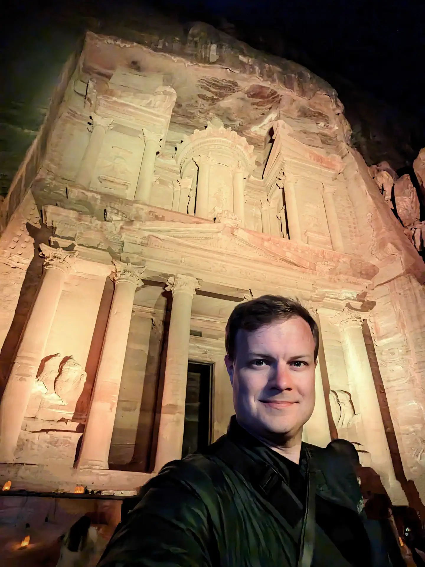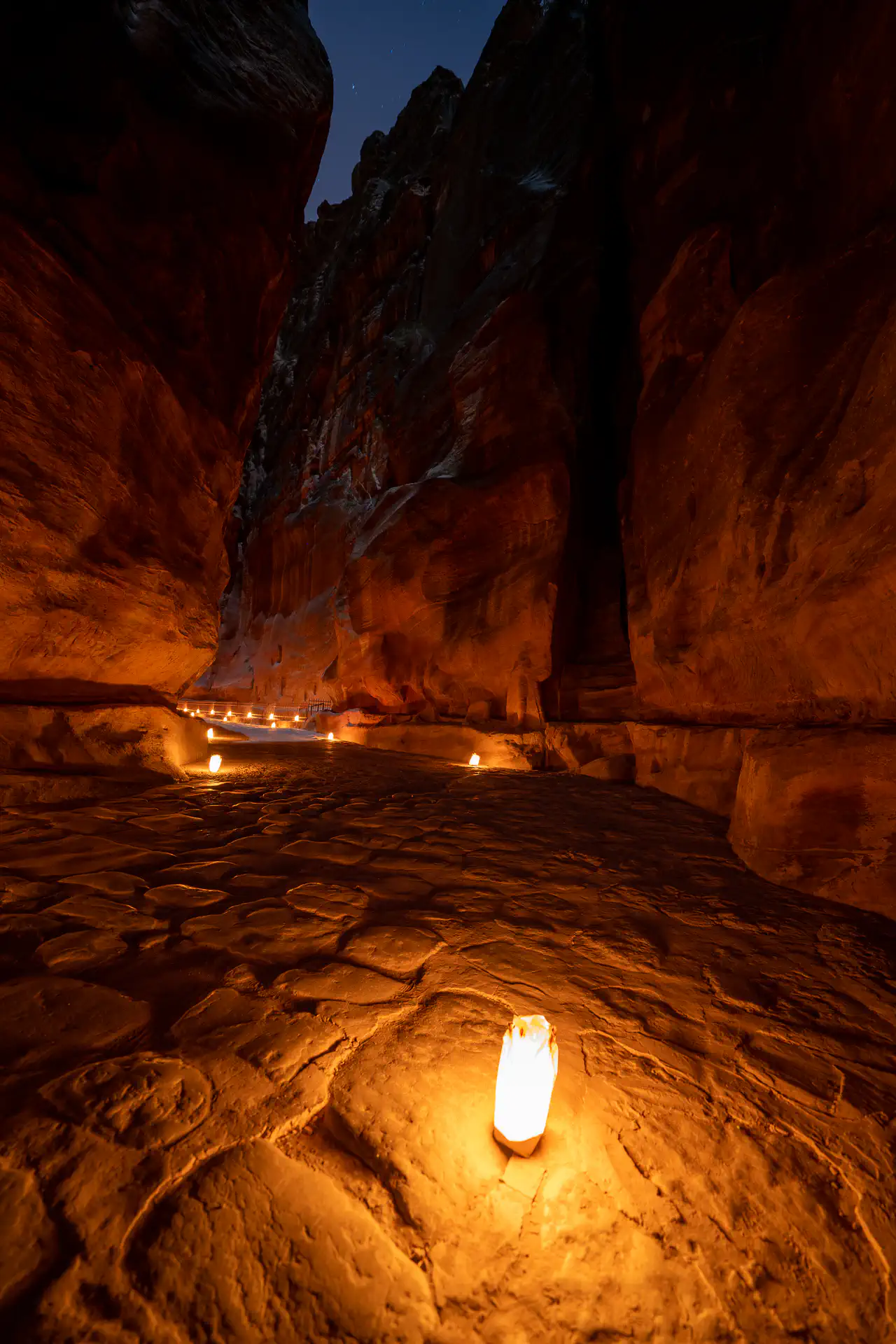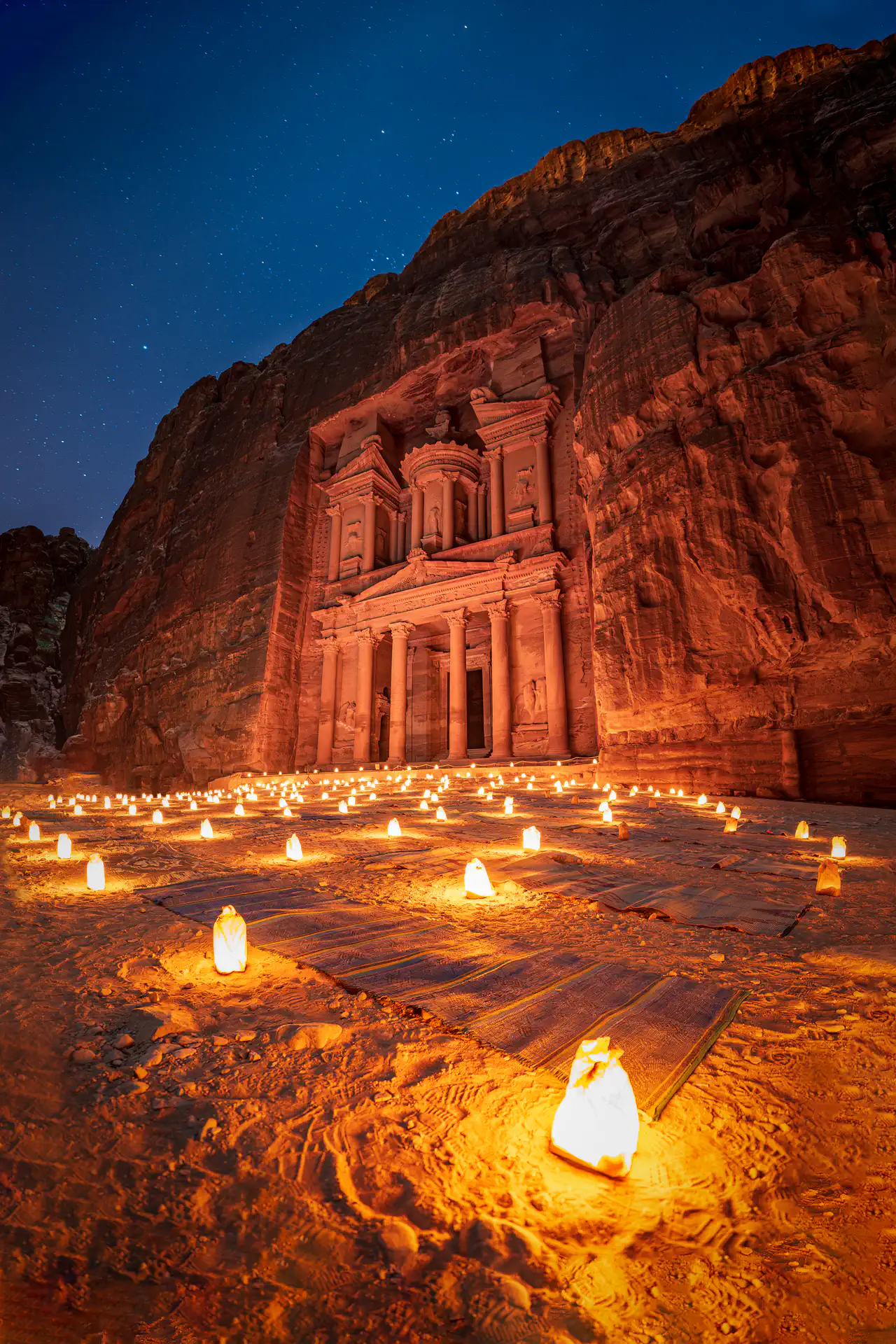 Three times a week, “Petra by Night” takes place and the entire Siq and Treasure are lit with over 1,500 “candles” ( I checked the bags to find electronic bulbs). It’s an extra $25 for the ticket, but the Treasury illuminated by candles was my original inspiration for booking the entire trip, so there was no choice. I got my ticket early and stood in line about 30 minutes before it opened. There were about 20 people ahead of me, but I sped-walk most of the way there only half tripping a few times in the dark. There was one snide remark made about me not enjoying the experience, but little did he know that I was rushing so I could enjoy the experience of having an empty Treasury area for about 2 minutes. Since my shutter speed was a whopping 30 seconds, and I had to find a spot to set up my tripod, this meant I got just 2 images before the hordes started descending, but that was enough! I cleverly cropped and Photoshopped out the few people and chairs that did make their way into my images, so if you go yourself, know that you’re going to share the environment with hundreds of other people. A cautionary note: sit on the chairs and not the mats. Cats roam the area and enjoy using the mats for their business. 🤢