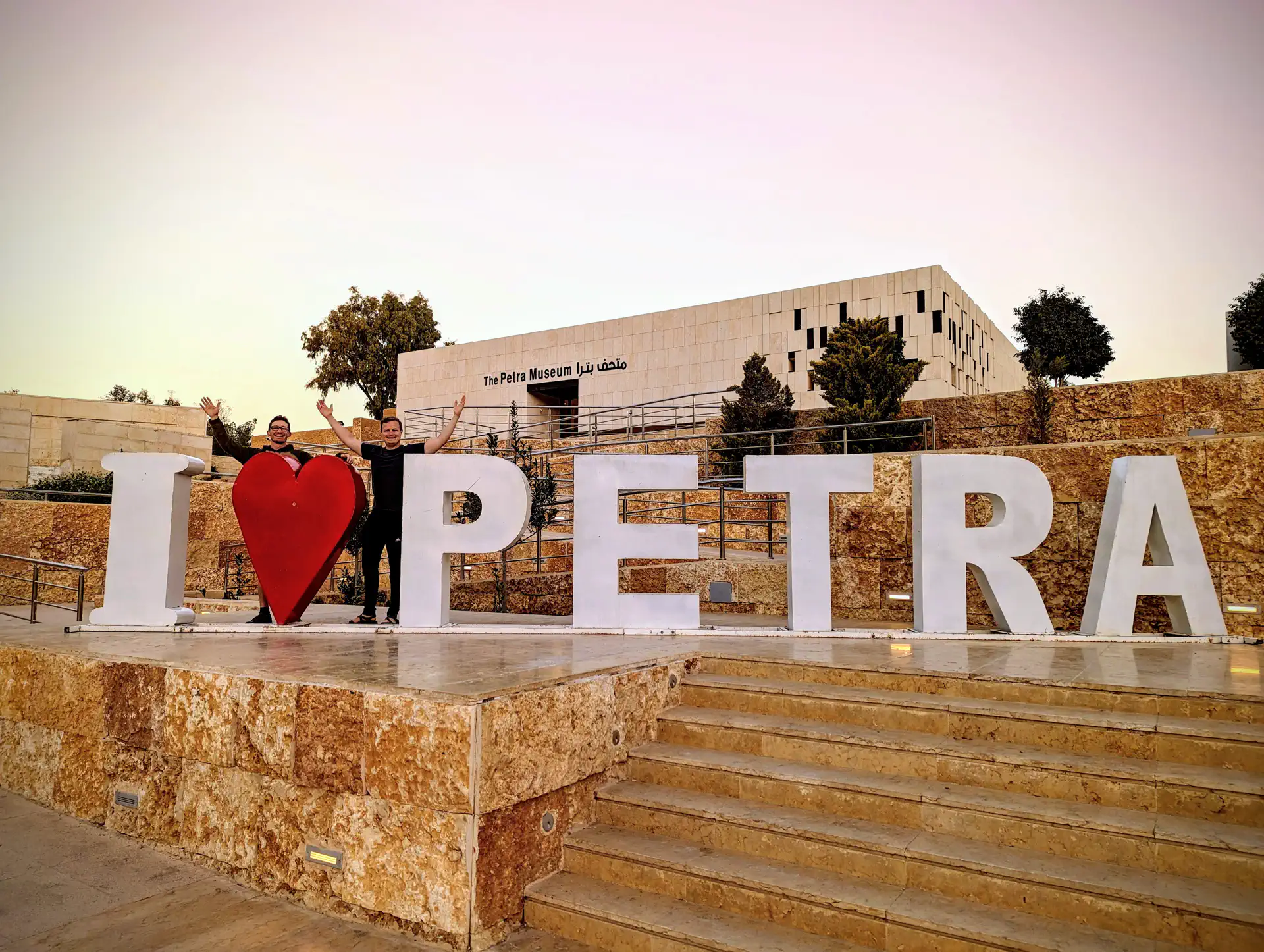 The next morning as our group began loading the bus, Heath and I jogged back down to the museum just outside the entrance to get a picture with the sign and the colorful sunrise before heading back north to Amman. 👬❤️